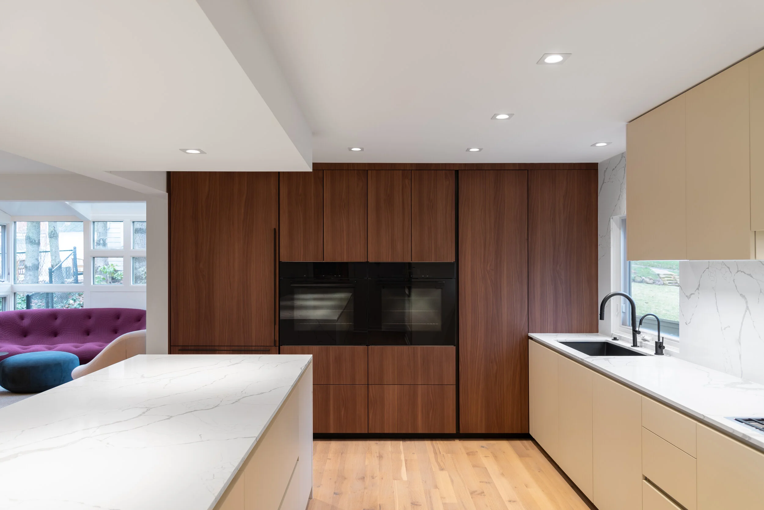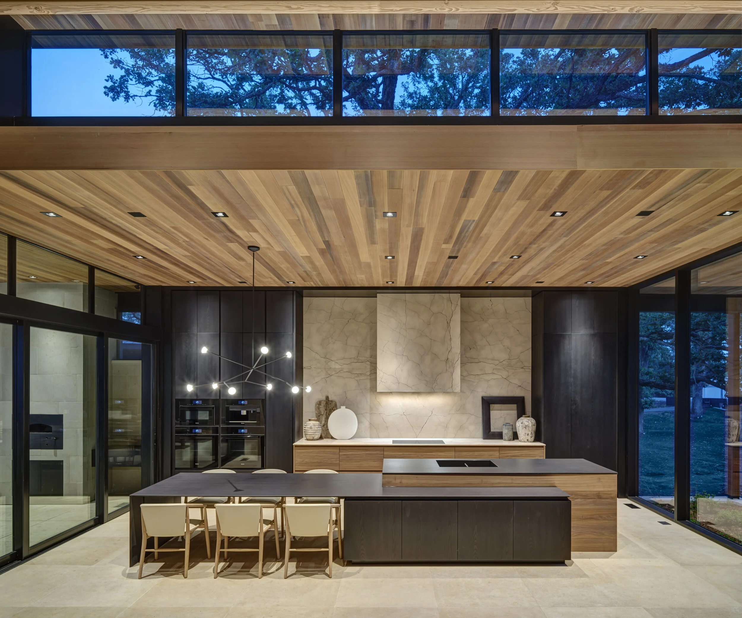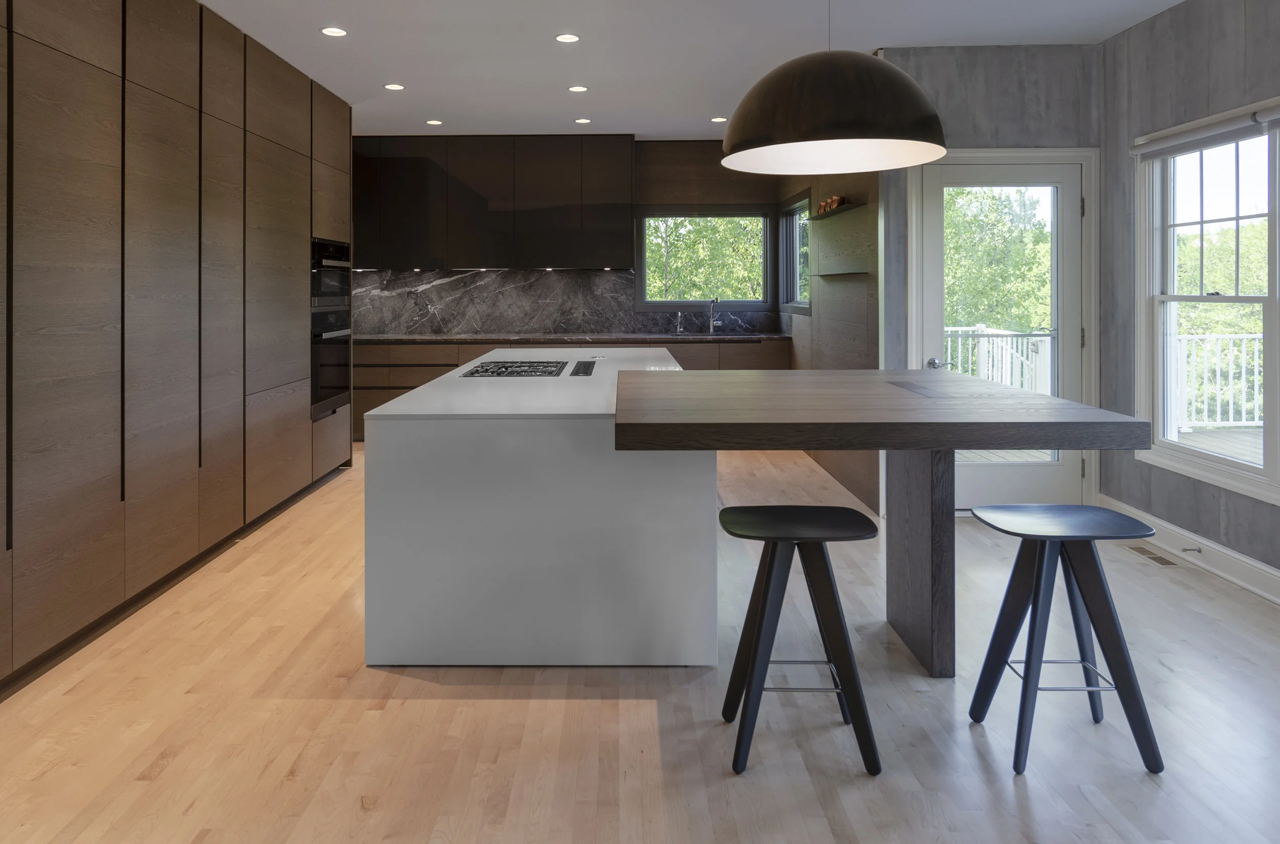 This is a beautiful expression of a contemporary lakeside family retreat. From the bespoke Poliform Kitchen, Roll & Hill chandelier and solid Cedar coffee table; furnishings were procured to evoke warmth, nature and timelessness. Our kitchen design is truly the heart of the home with a spectacular combination of materials including a full height Croatian limestone backsplash, solid walnut and black elm cabinetry and Dekton countertops. Interior design and cabinetry by Projects. Architecture by Robert Neylan. Cameron Campbell Photography.