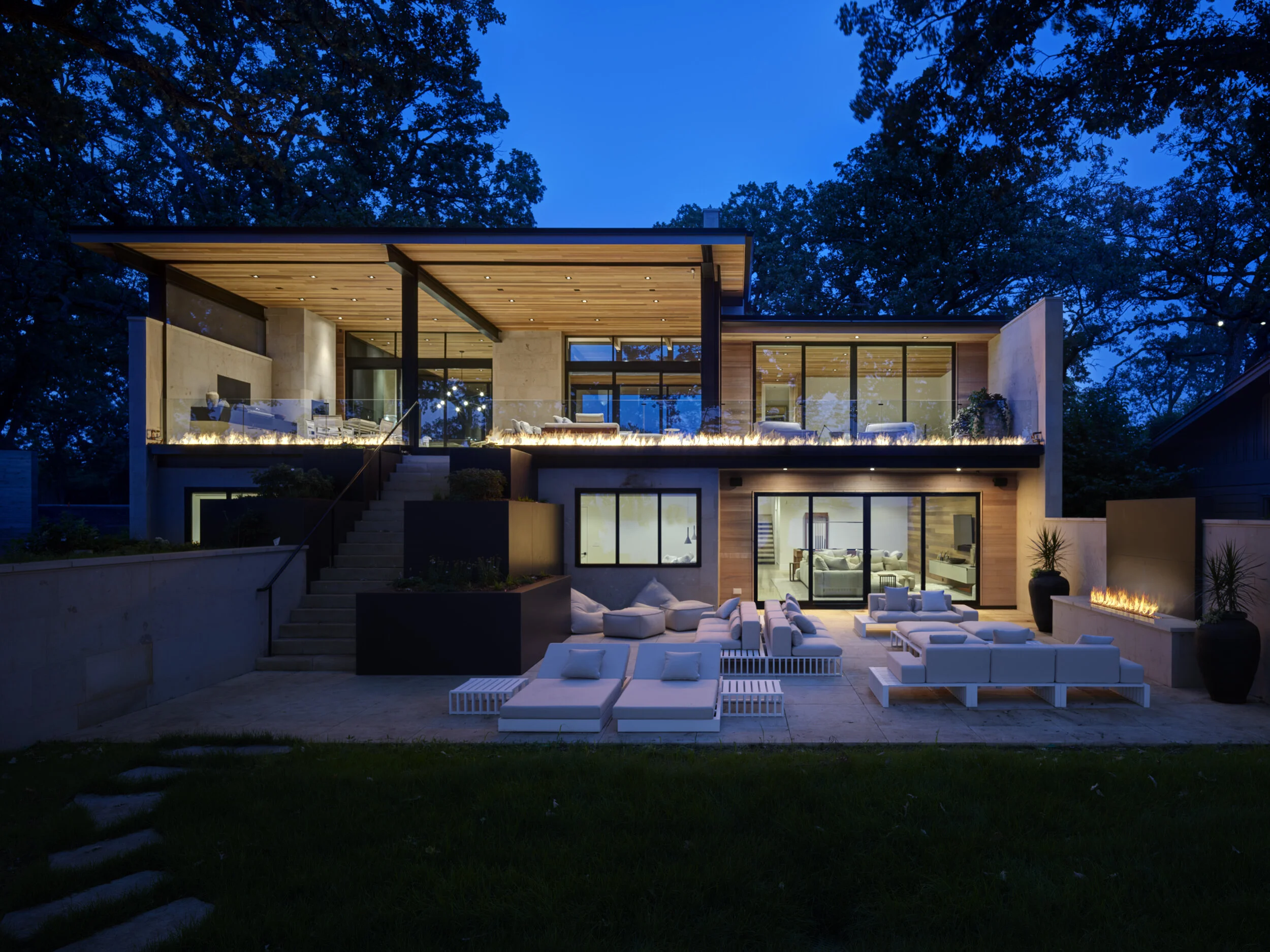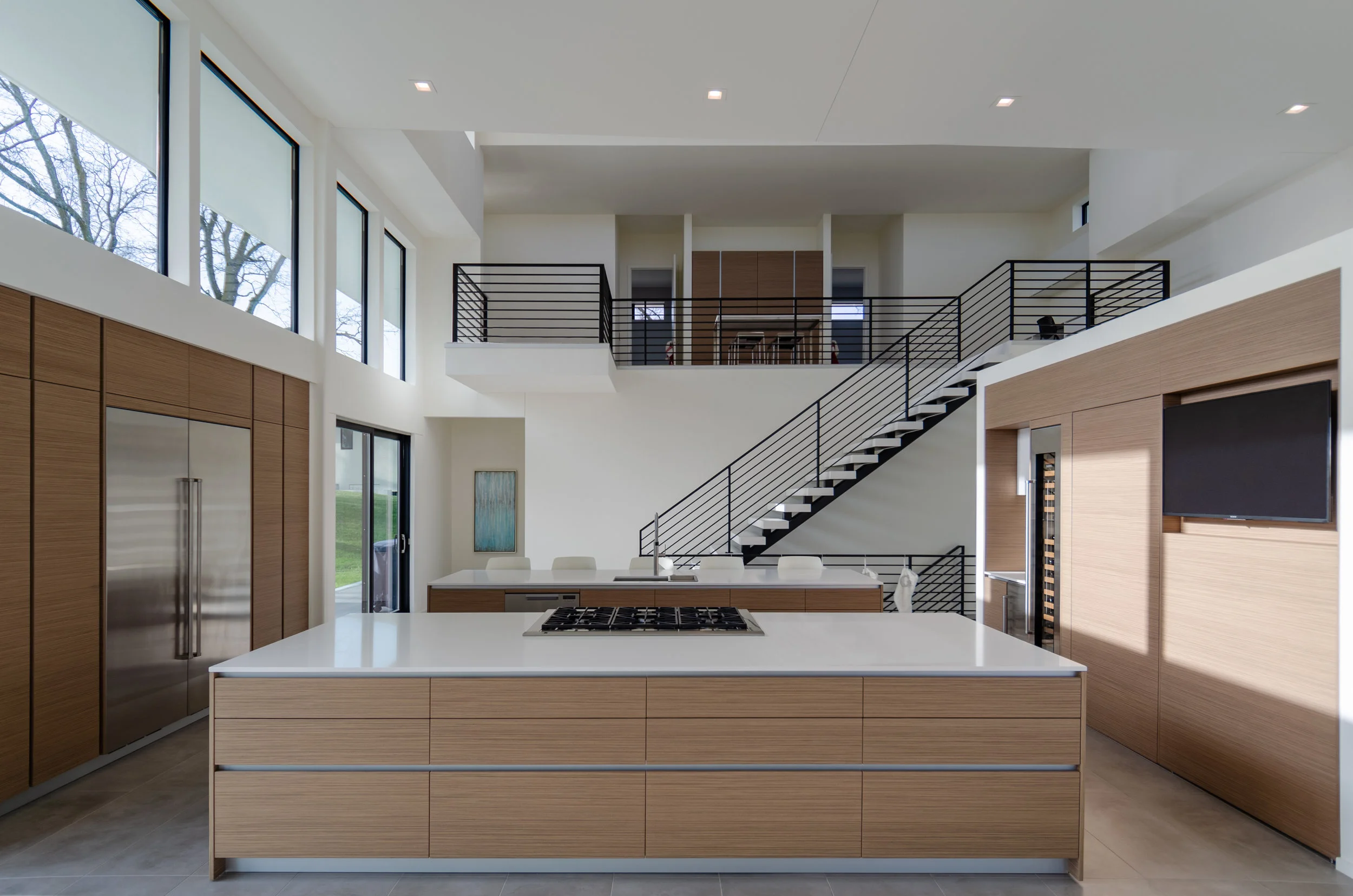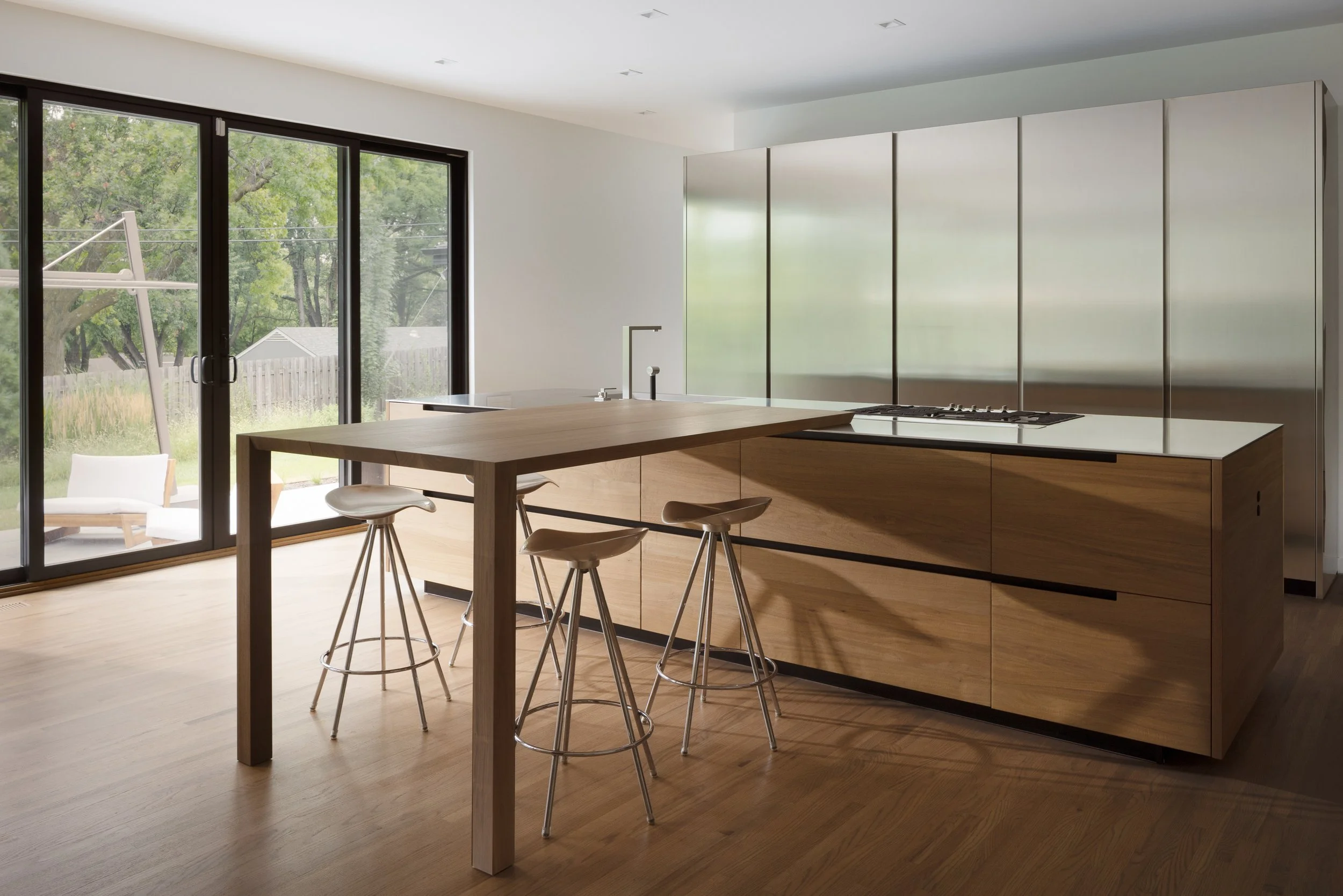 This is a beautiful expression of a contemporary lakeside family retreat. From the bespoke Poliform Kitchen, Roll & Hill chandelier and solid Cedar coffee table; furnishings were procured to evoke warmth, nature and timelessness. Our kitchen design is truly the heart of the home with a spectacular combination of materials including a full height Croatian limestone backsplash, solid walnut and black elm cabinetry and Dekton countertops. Interior design and cabinetry by Projects. Architecture by Robert Neylan. Cameron Campbell Photography.